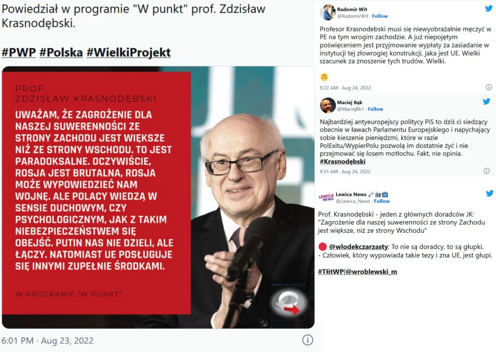 P(ośle) Krasnodębski, zachował się pan jak zdrajca polskiej racji stanu. Podważa pan sens naszej współpracy i bezpieczeństwa, jakie daje nam członkostwo w Unii Europejskiej, za które to wartości umiera tysiące niewinnych ludzi w trwającej od pół roku wojnie w Ukrainie, ze zbrodniczym reżimem Putina, a jednocześnie garściami czerpie pan profity finansowe z podobno „wrogiej UE i państwa niemieckiego”. To wyjątkowa podłość i nieprzyzwoitość. Swoją postawą potwierdza pan prawdziwość słów wybitnego neurobiologa, Prof. Jerzego Vetulaniego, „Nie poznawaj ludzi po stopniach i tytułach. Jest wielu wybitnych ludzi wśród robotników czy sprzątaczek i wielu idiotów wśród profesorów” oraz znaną niemal od zawsze prawidłowość o tym, „że dwóch rzeczy zwalczyć niepodobna – siły ciążenia i…ludzkiej głupoty”…oraz nikczemności i łajdactwa.
