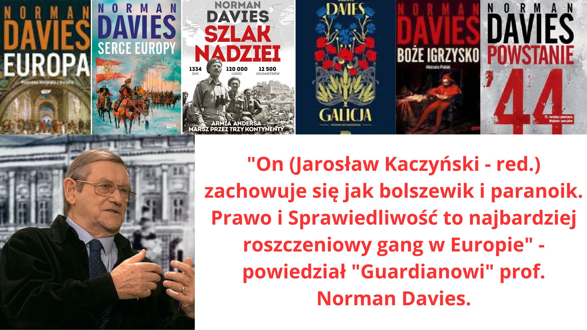 Norman Davies – światowej sławy brytyjsko-polski historyk, pochodzenia angielsko-walijskiego, nagrodzony licznymi nagrodami za swoje wybitne zasługi dla nauki, odznaczony między innymi Orderem Odrodzenia Polski i Krzyżem Wielkim Orderu Zasługi Rzeczypospolitej Polskiej, stwierdził, że „Jarosław Kaczyński zachowuje się jak bolszewik i paranoik. Prawo i sprawiedliwość to najbardziej roszczeniowy gang w Europie”.