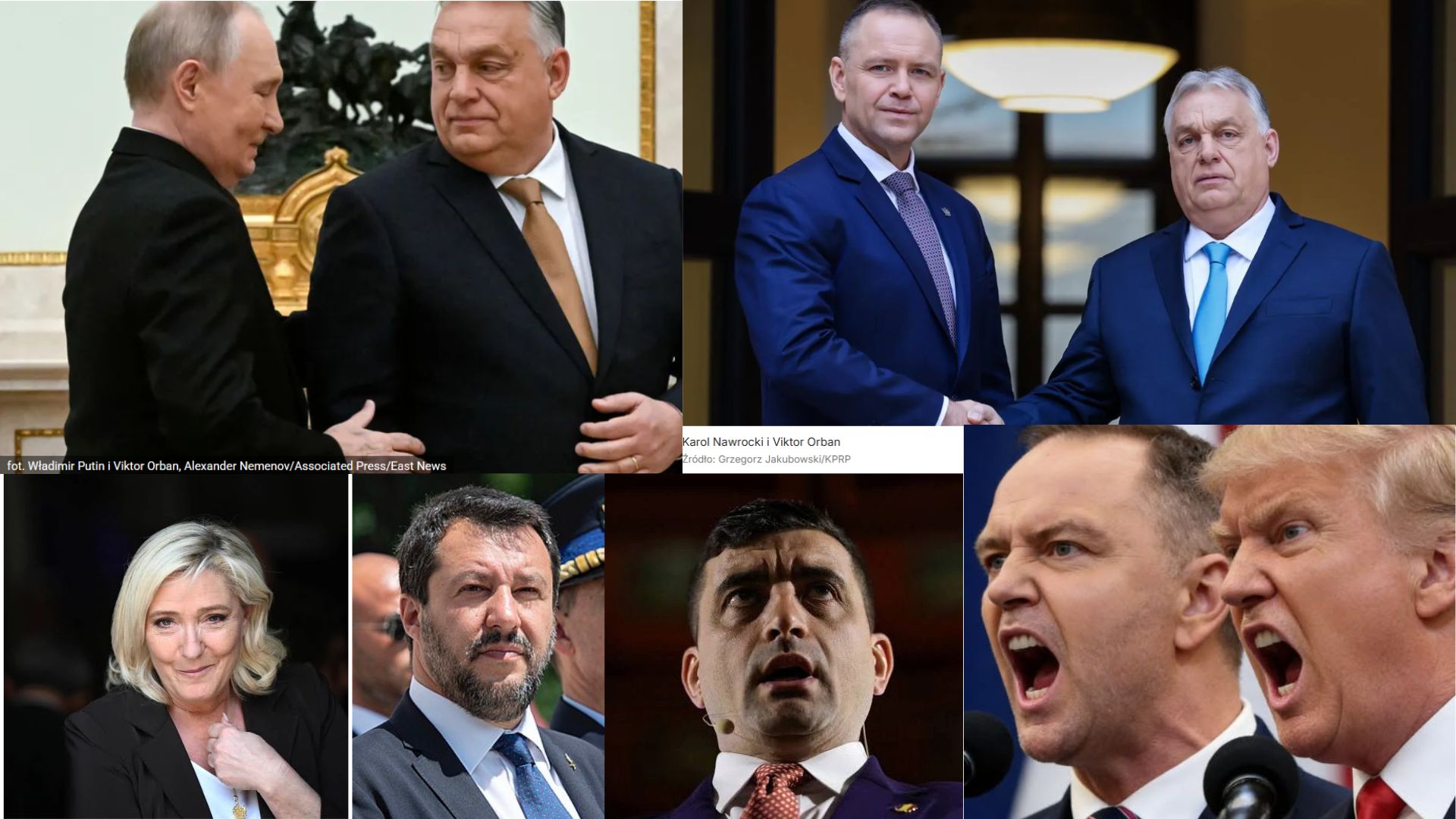 23 III 2026, Budapeszt – Karol Nawrocki ściska dłoń antyunijnego lidera Viktora Orbána, otoczonego sojusznikami Putina: Marine Le Pen, Matteo Salvinim i ”pożytecznym idiotą” – Krzysztofem Bosakiem. Niedawno pozował też z rumuńskim ultranacjonalistą George Simionem.