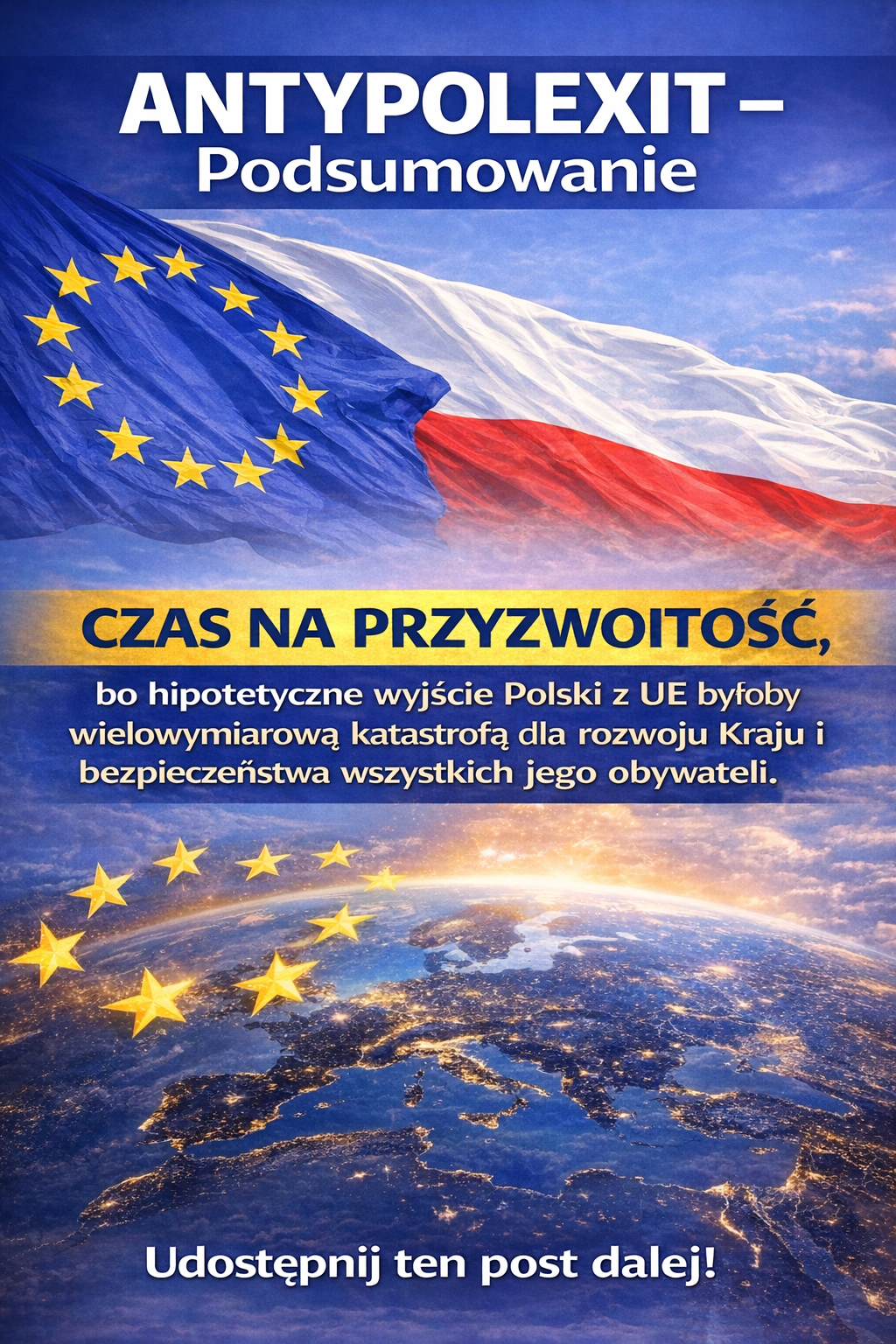 Te dwanaście publikacji (łącznie z dzisiejszym postem) miały zrealizować – jeden cel: pokazać, że wyprowadzenie Polski z Unii byłoby wielowymiarową katastrofą – od utraty miliardów euro i targanego kryzysami rynku zbytu, po osłabienie obronności i odebranie młodym ludziom perspektyw rozwoju. Zachęcam Was do udostępniania tego podsumowania – niech stanie się kompendium szybkich, rzetelnych argumentów w codziennych dyskusjach, a jednocześnie manifestem sprzeciwu wobec kłamliwej propagandy zwolenników Polexitu.